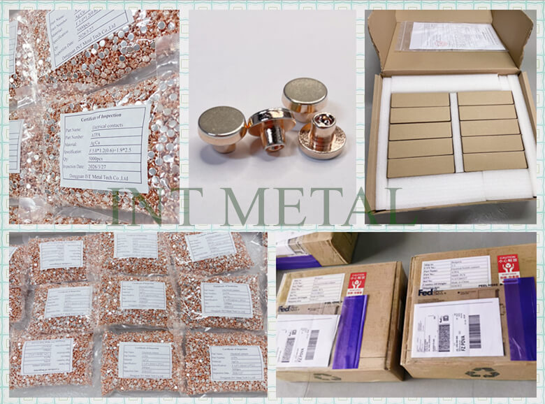 DONGGUAN INT METAL TECH CO LTDКүміс немесе күміс қорытпасын қатты қысым арқылы қатты күйдегі мысты біріктіретін суық престеу композиттік (суық тию) процесін қабылдайды. Бұл процесс күміс қабатының біркелкі қалыңдығын және өте жоғары байланыстыру беріктігін қамтамасыз етеді күміс контактілершығарғанINT METALтұтынушы өнімдерінің өмір бойы сенімділігіне кепілдік бере алады.
